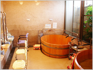 「ひのき」風呂に注がれるお湯は、山鹿・平山温泉の源泉を使用しています。